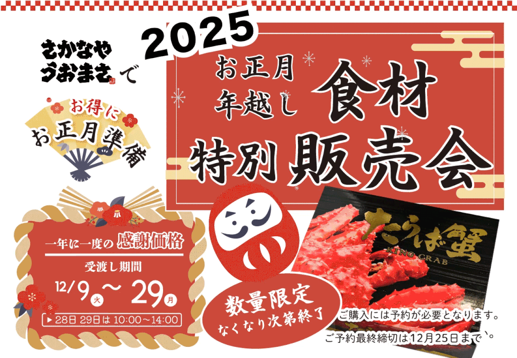 福岡・久留米の「さかなやうおまさ」では、2025年も年に一度の人気イベント「お正月年越し食材特別販売会」を開催します!