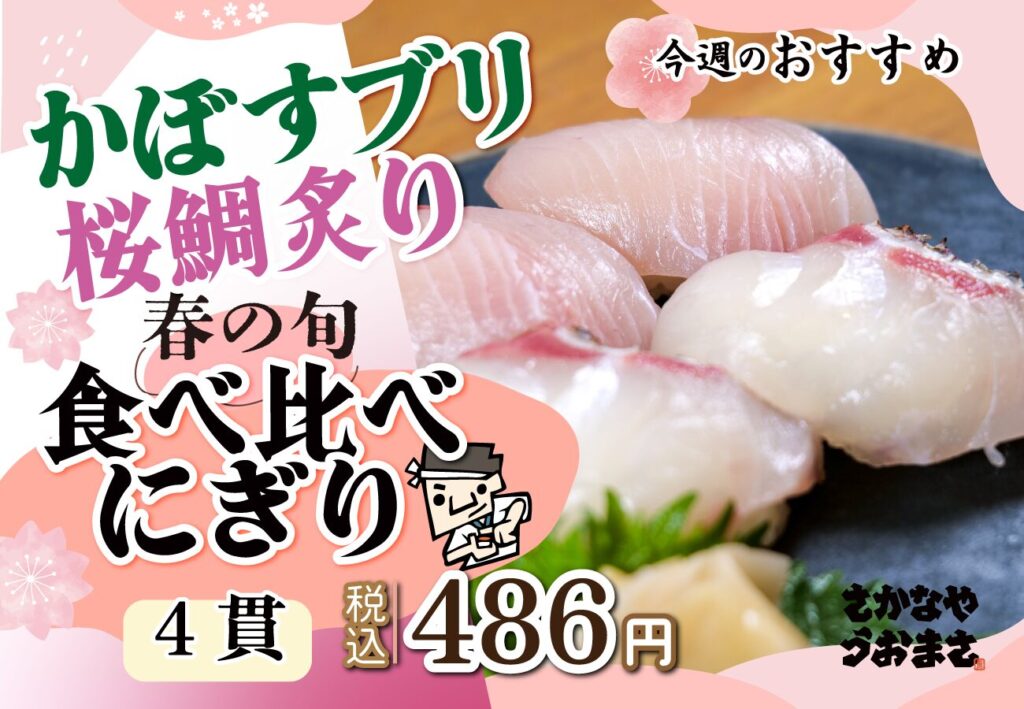今週の「さかなやうおまさ」おすすめは、 かぼすブリ2貫・桜鯛炙り2貫を一度に楽しめる 「春の旬の食べ比べにぎり」です。