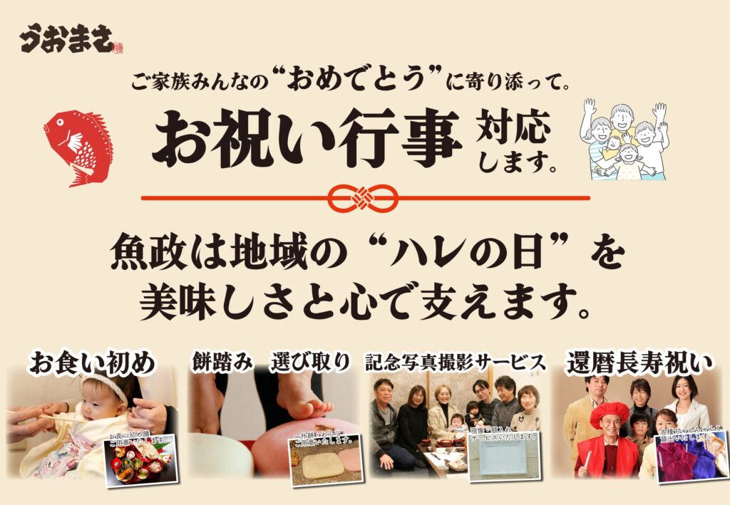 お食い初め・餅踏み・還暦祝いなど、ご家族の笑顔が集う特別な日に、魚政の味をぜひご利用ください。