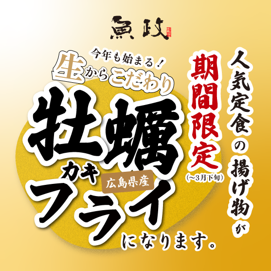 【魚政】期間限定で再登場!広島県産生カキ使用「手作り大粒カキフライ」 〜人気ランチ定食が今だけ特別仕様に〜