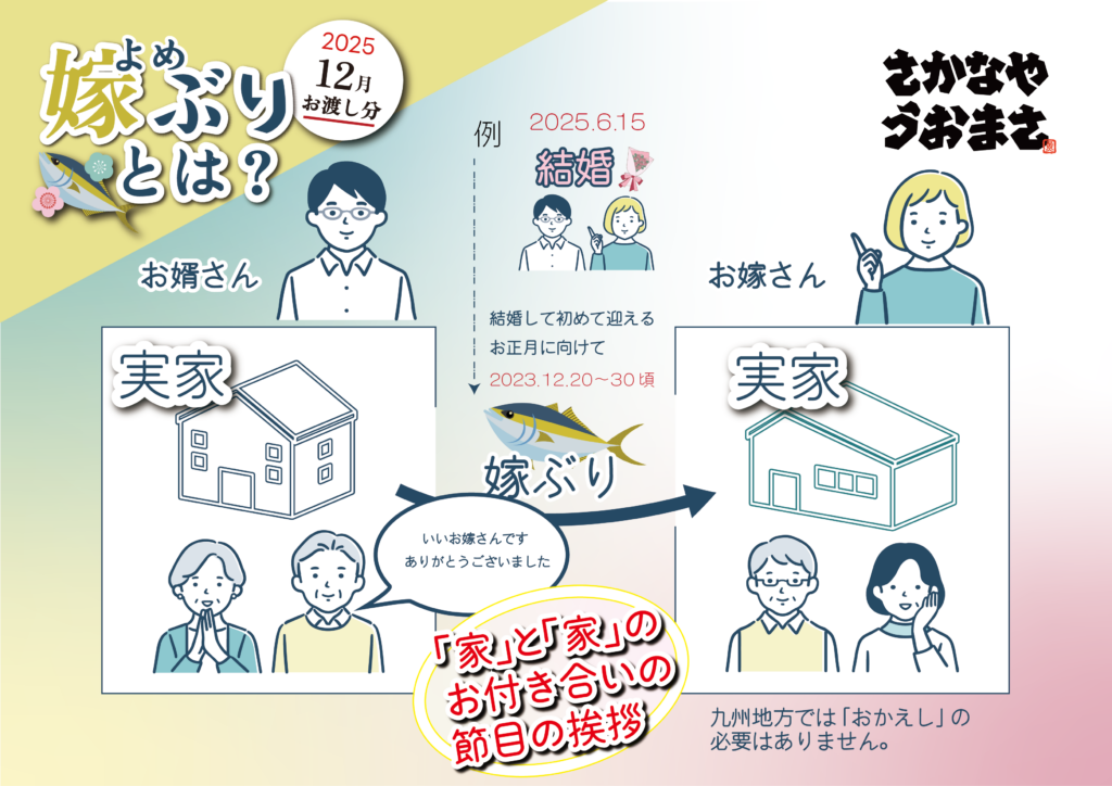 「嫁ぶり(よめぶり)」とは、結婚して初めて迎えるお正月に向けて、お婿さんの実家の方から→お嫁さんの実家へぶりを送ります。